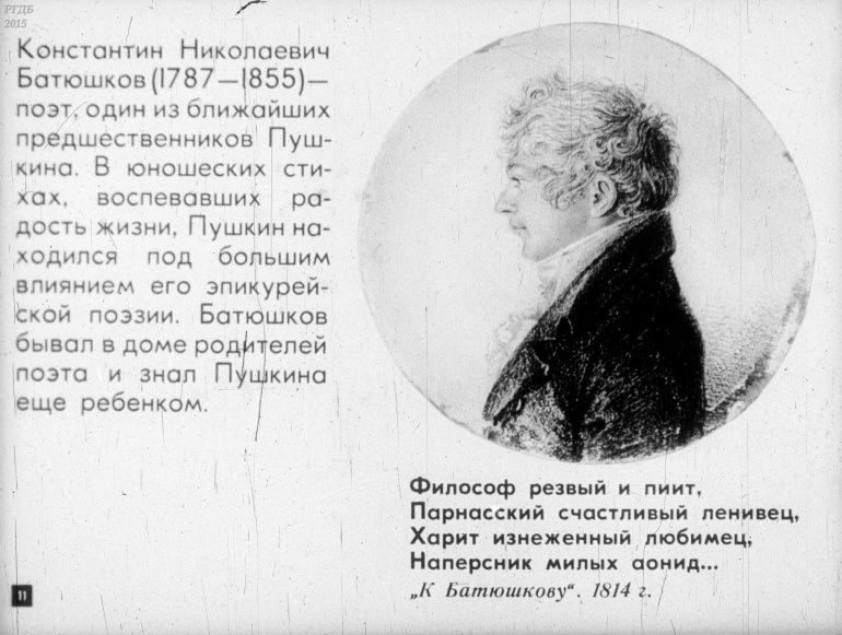 Константин Николаевич Батюшков (1787 — 1855)— поэт, один из ближайших предшественников Пушкина. В юношеских стихах, воспевавших радость жизни, Пушкин находился под большим влиянием его эпикурейской поэзии. Батюшков бывал в доме родителей поэта и знал Пушкина еще ребенком.