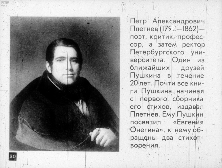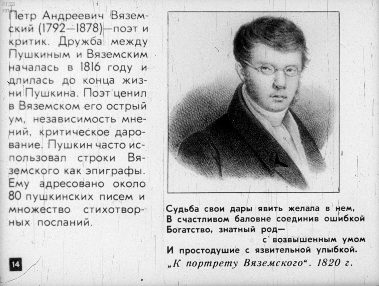Петр Андреевич Вяземский (1792—1878) - поэт и критик. Дружба между Пушкиным и Вяземским началась в 1816 году и длилась до конца жизни Пушкина. Поэт ценил в Вяземском его острый ум, независимость мнений, критическое дарование. Пушкин часто использовал строки Вяземского как эпиграфы. Ему адресовано около 80 пушкинских писем и множество стихотворных посланий.