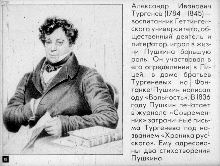 Александр Иванович Тургенев (1784 — 1845) — воспитанник Геттингенского университета, общественный деятель и литератор, играл в жизни Пушкина большую роль. Он участвовал в его определении в Лицей, в доме братьев Тургеневых на Фонтанке Пушкин написал оду «Вольность». В 1836 году Пушкин печатает в журнале «Современник» заграничные письма Тургенева под названием «Хроника русского». Ему адресованы два стихотворения Пушкина.
