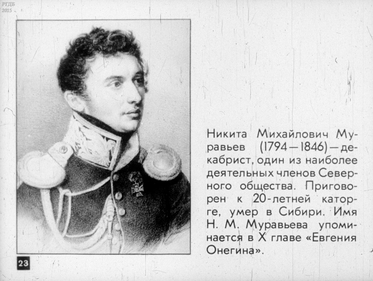 Никита Михайлович Муравьев (1794—1846) —декабрист, один из наиболее деятельных членов Северного общества. Приговорен к 20-летней каторге, умер в Сибири. Имя Н. М. Муравьева упоминаете в X главе «Евгения Онегина».