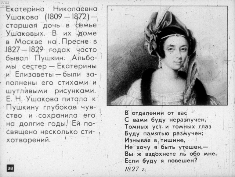 Екатерина Николаевна Ушакова (1809 - 1872) - старшая дочь в семье Ушаковых. В их доме в Москве на Пресне в 1827 —1829 годах часто бывал Пушкин. Альбомы сестер — Екатерины и Елизаветы — были заполнены его стихами и шутливыми рисунками.