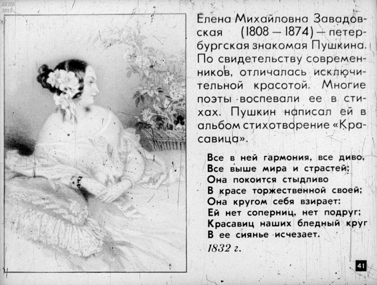 Елена Михайловна Завадовская (1808 — 1874) - петербургская знакомая Пушкина. По свидетельству современников, отличалась исключительной красотой. Многие поэты - воспевали ее в стихах. Пушкин написал ей в альбом стихотворение «Красавица».