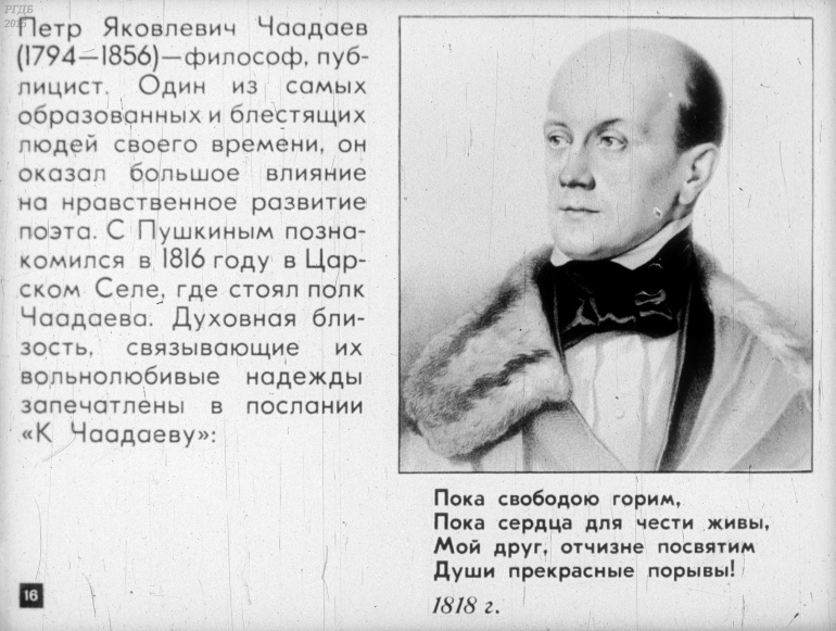 Петр Яковлевич Чаадаев (1794—1856) — философ, публицист. Один из самых образованных и блестящих людей своего времени, он оказал большое влияние на нравственное развитие поэта. С Пушкиным познакомился в 1816 году в Царском Селе, где стоял полк Чаадаева. Духовная близость. связывающие их вольнолюбивые надежды запечатлены в послании «К Чаадаеву»: