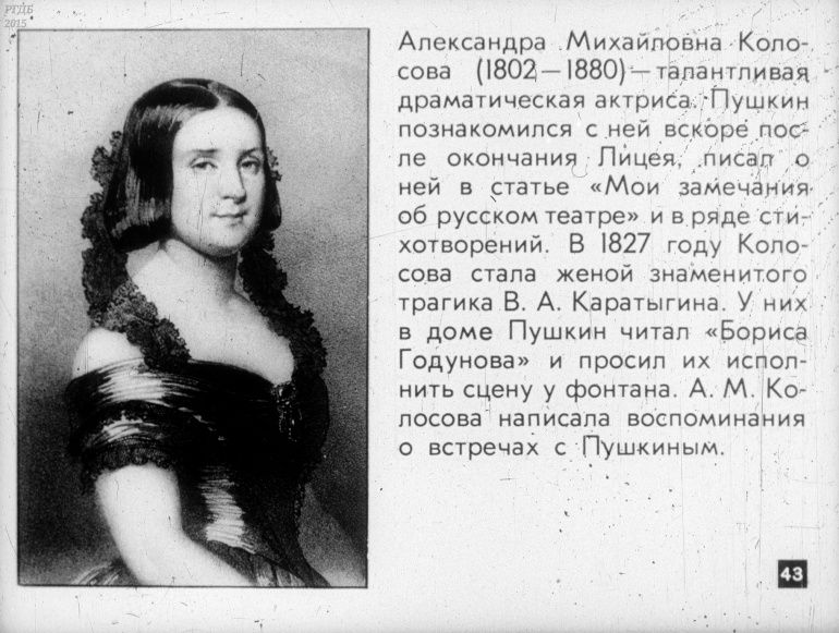 Александра Михайловна Колосова (1803—1880) - талантливая драматическая актриса, Пушкин познакомился с ней вскоре после окончания Лицея, писал о ней в статье «Мои замечания об русском театре» и в ряде стихотворений. В 1827 году Колосова стала женой знаменитого трагика В. А. Каратыгина. У них в доме Пушкин читал «Борису Годунова» и просил их исполнить сцену у фонтана. А. М. Колосова написала воспоминания о встречах с Пушкиным.