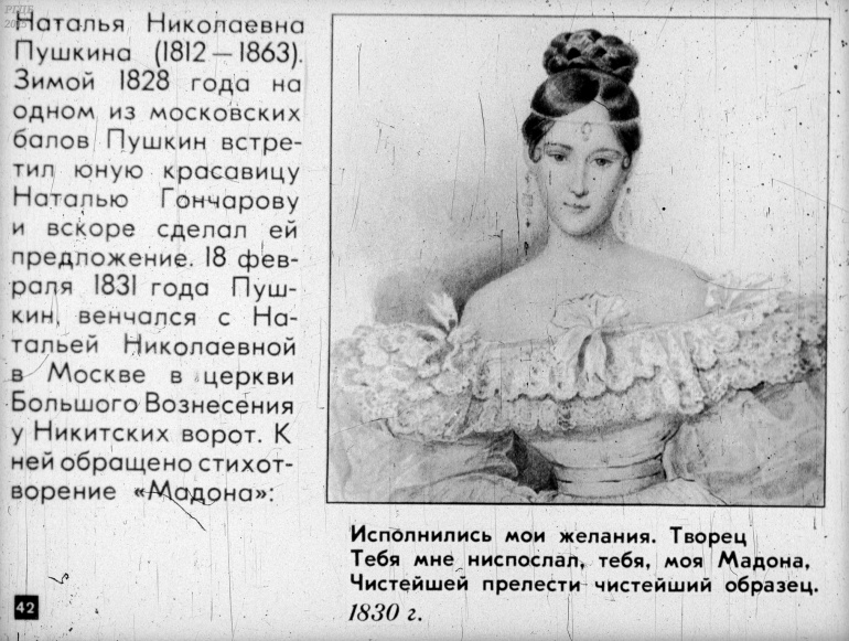 Наталья Николаевна Пушкина (1812 — 1863) Зимой 1828 года на одном из московских балов Пушкин встретил юную красавицу Наталью Гончарову и вскоре сделал ей предложение. 18 февраля 1831 года Пушкин» венчался с Натальей Николаевной в Москве в церкви Большого Вознесения у Никитских ворот. К ней обращено стихотворение «Мадона»: