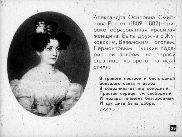 Александра Осиповна Смирнова-Россет (1809—1882) — широко образованная красивая женщина. Была дружна с Жуковским, Вяземским, Гоголем, Лермонтовым. Пушкин подарил ей альбом, на первой странице которого написал стихи: