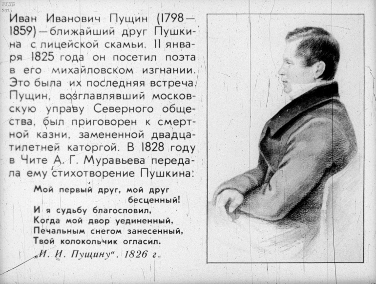 Иван Иванович Пущин (1798 — 1859) — ближайший друг Пушкина с лицейской скамьи. 11 января 1825 года он посетил поэта в его михайловском изгнании. Это была их последняя встреча. Пущин. возглавлявший московскую управу Северного общества, был приговорен к смертной казни, замененной двадцатилетней каторгой. В 1828 году в Чите Д. Г. Муравьева передала ему стихотворение Пушкина: