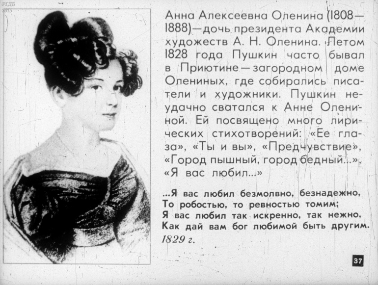 в Приютине —загородном доме Олениных, где собирались писатели и художники. Пушкин неудачно сватался к Анне Олениной. Ей посвящено много лирических стихотворений: «Ее глаза», «Ты и вы», "Предчувствие", "Город пышный, город бледный...", «Я вас любил...»: