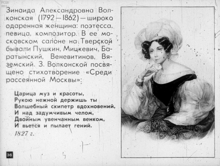 Зинаида Александровна Волконская (1792 - 1862) — широко одаренная жейщина: поэтесса, певица, композитор. В её московском салоне на Тверской бывали Пушкин, Мицкевич, Баратынский, Веневитинов, Вяземский. 3. Волконской посвящено стихотворение «Среди рассеянной Москвы»: