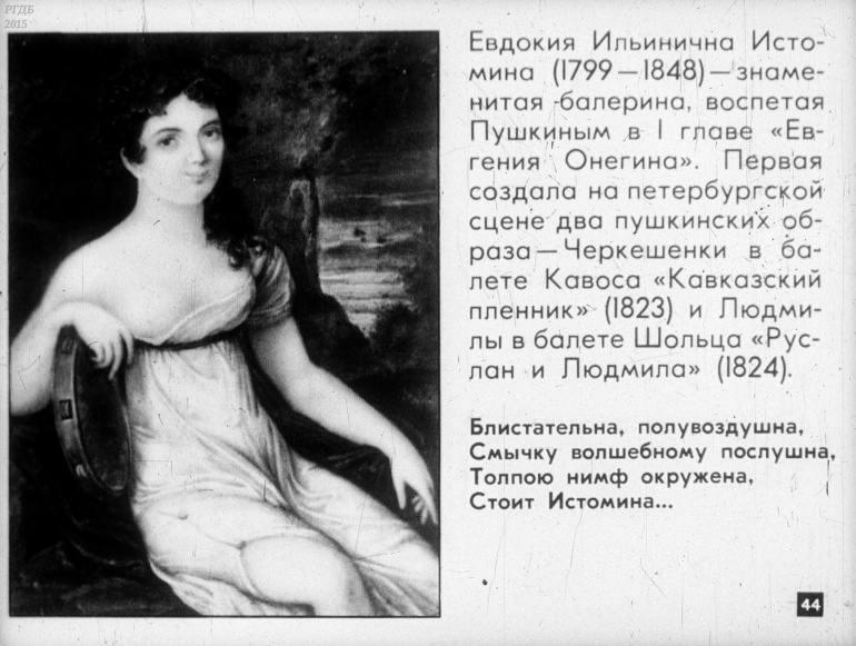 Евдокия Ильинична Истомина (1799 —1848) —знаменитая балерина, воспетая Пушкиным в I главе «Евгения Онегина». Первая создала на петербургской сцене два пушкинских образа — Черкешенки в балете Кавоса «Кавказский пленник» (1823) и Людмилы в балете Шольца «Руслан и Людмила» (1824).