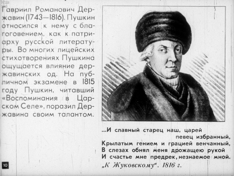 Гавриил Романович Державин (1743—1816). Пушкин Относился к нему с благоговением, как к патриарху русской литературы. Во многих лицейских стихотворениях Пушкина ощущается влияние державинских од. На публичном экзамене в 1815 году Пушкин, читавший «Воспоминания в Царской Селе», поразил Державина своим талантом.