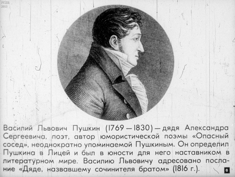 Василий ЛьвЬвич Пушкин (1769 — 1830) — дядя Александра Сергеевича, поэт, автор юмористической поэмы «Опасный сосед», неоднократно упоминаемой Пушкиным. Он определил Пушкина в Лицей и был в юности для него наставником в литературном мире. Василию Львовичу адресовано послание «Дяде, назвавшему сочинителя братом» (1816 г.).