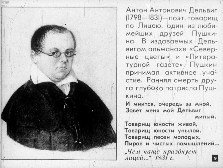 Антон Антонович Дельвиг (1798—1831)—поэт, товарищ по Лицею, один из любимейших друзей Пушкина. В издаваемых Дельвигом альманахе «Северные цветы» и «Литературной газете» Пушкин принимал активное участие. Ранняя смерть друга глубоко потрясла Пушкина.