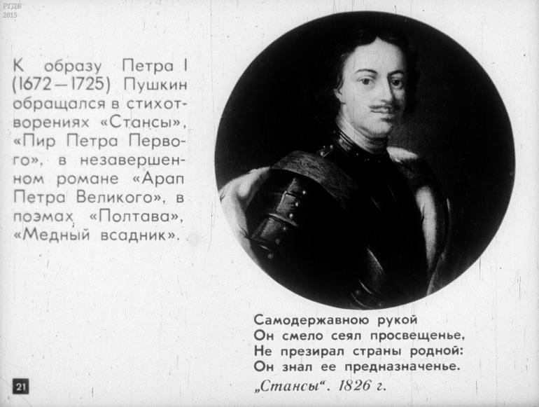 К образу Петра I (1672-1725) Пушкин обращался в стихотворениях «Стансы», «Пир Петра Первого», в незавершенном романе «Арап Петра Великого», в поэмах «Полтава», «Медный всадник».