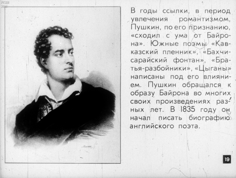 В годы ссылки, в период увлечения романтизмом, Пушкин, по его признанию, «сходил с ума от Байрона». Южные поэмы «Кавказский пленник», «Бахчисарайский фонтан», «Братья-разбойники», «Цыганы» написаны под его влиянием. Пушкин обращался к образу Байрона во многих своих произведениях разных лет. В 1835 году он начал писать биографию английского поэта.