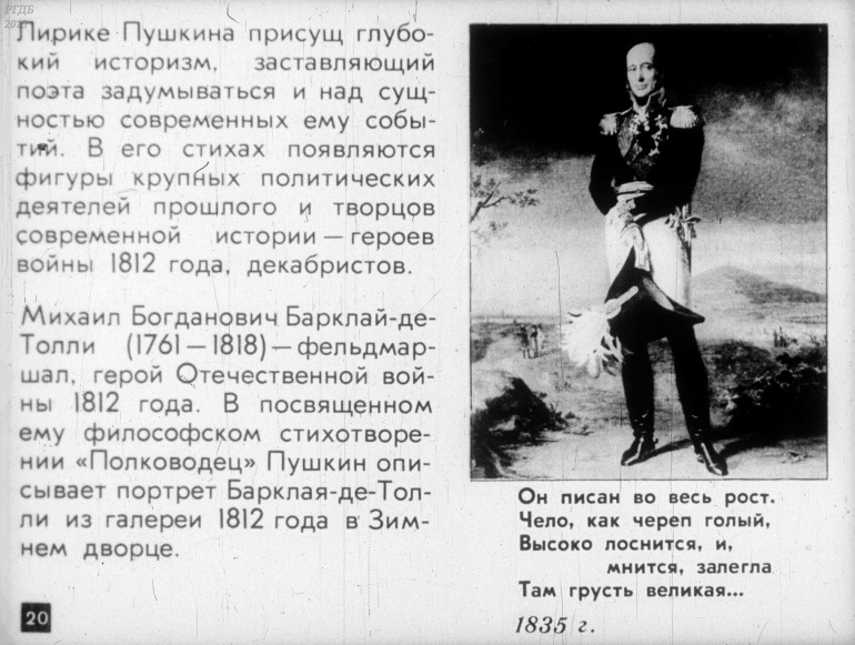 Михаил Богданович Барклай-де-Толли (1761 —1818) — фельдмаршал, герой Отечественной войны 1812 года. В посвященном ему философском стихотворении «Полководец» Пушкин описывает портрет Барклая-де-Тол-ли из галереи 1812 года в Зимнем дворце.