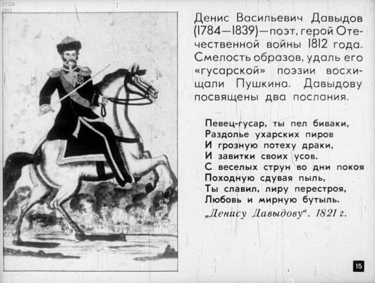 Денис Васильевич Давыдов (1784—1839)—поэт, герой Отечественной войны 1812 года. Смелость образов, удаль его «гусарской» поэзии восхищали Пушкина. Давыдову посвящены два послания.