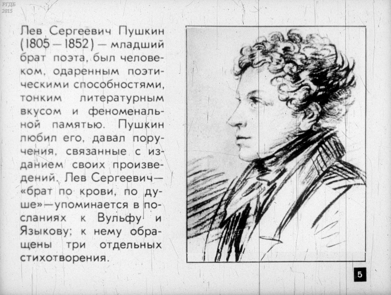 Лев Сергеевич Пушкин (1805 — 1852) — младший брат поэта, был человеком, одаренным поэтическими способностями, тонким литературным вкусом и феноменальной памятью. Пушкин любил его, давал поручения, связанные с изданием своих произведений, Лев Сергеевич — «брат по крови, по душе» — упоминается в посланиях к Вульфу и Языкову; к нему обращены три отдельных стихотворения.