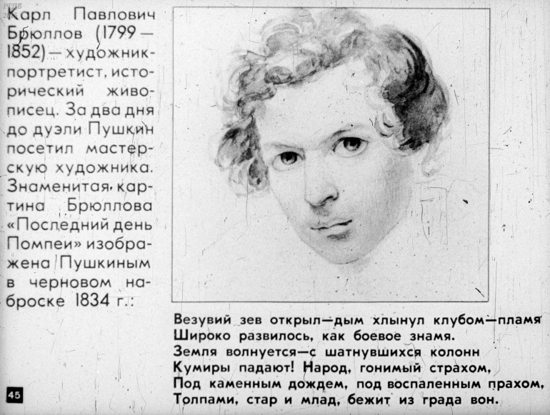 Карл Павлович Брюллов (1799 — 1852) — художник-портретист, исторический живописец. За два дня до дуэли Пушкин посетил мастерскую художника. Знаменитая картина Брюллова «Последний день Помпеи» изображена Пушкиным в черновом наброске 1834 г.: