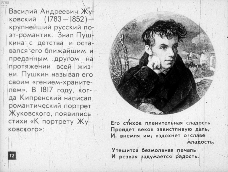 преданном другом на протяжении всей жизни. Пушкин называл его своим «гением-хранителем». В 1817 году, когда Кипренский написал романтический портрет Жуковского, появились стихи «К портрету Жуковского»: