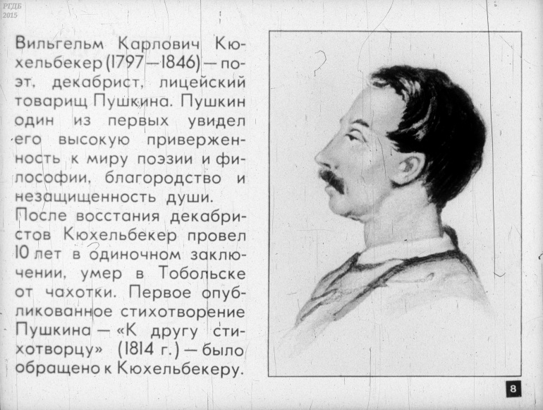 Вильгельм Карлович, Кюхельбекер (1797 — 1846)— поэт, декабрист, лицейский товарищ Пушкина. Пушкин один из первых увидел его высокую приверженность к миру поэзии и философии, благородство и незащищенность души. После восстания декабристов Кюхельбекер провел 10 лет в одиночном заключении, умер в Тобольске от чахотки. Первое опубликованное стихотворение Пушкина — «К другу стихотворцу» (1814 г.) — было обращено к Кюхельбекеру.