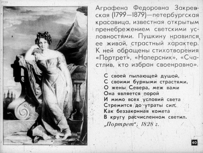 Аграфена Федоровна Закревская (1799—1879) — петербургская красавица, известная открытым пренебрежением светскими условностями. Пушкину нравился ее живой, страстный характер. К ней обращены стихотворения "Портрет", «Наперсник», «Счастлив, кто избран своенравно».