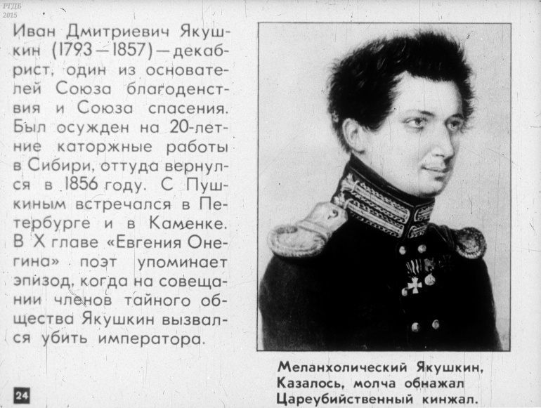 Иван Дмитриевич Якушкин (1793 —1857) — декабрист, один из основателей Союза благоденствия и Союза спасения. Был осужден на 20-летние каторжные работы в Сибири, оттуда вернулся в 1856 году. С Пушкиным встречался в Петербурге и в Каменке. В X главе «Евгения Онегина» , поэт упоминает эпизод, когда на совещании членов тайного общества Якушкин вызвался убить императора.