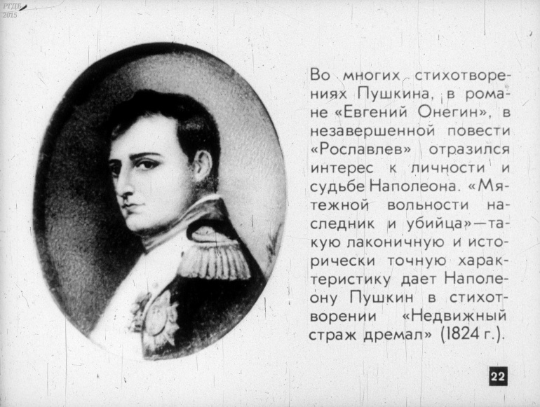 Во многих стихотворениях Пушкина, в романе «Евгений Онегин», в незавершенной повести «Рославлев» , отразился интерес к личности и судьбе Наполеона. «Мятежной вольности наследник и убийца»—такую лаконичную и исторически точную характеристику дает Наполеону Пушкин в стихотворении «Недвижный страж дремал» (1824 г.).