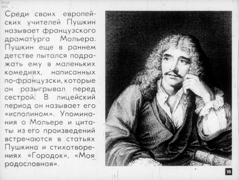 Среди своих европейских учителей Пушкин называет французского драматурга Мольера. Пушкин еще в раннем детстве пытался подражать ему в маленьких комедиях, написанных по-французски, которые он разыгрывал перед сестрой. В лицейский период он называет его «исполином». Упоминания о Мольере и цитаты из его произведений встречаются в статьях Пушкина и стихотворениях «Городок», «Моя родословная».