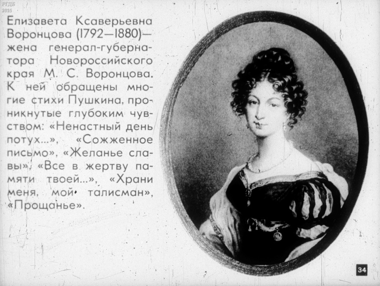Елизавета Ксаверьевна Воронцова (1792—1880) — жена генерал-губернатора Новороссийского края М. С. Воронцова. К ней обращены многие стихи Пушкина, проникнутые глубоким чувством: «Ненастный день потух...», «Сожженное письмо», «Желанье славы», «Все в жертву памяти твоей...», «Храни меня, мой талисман», «Прощанье».