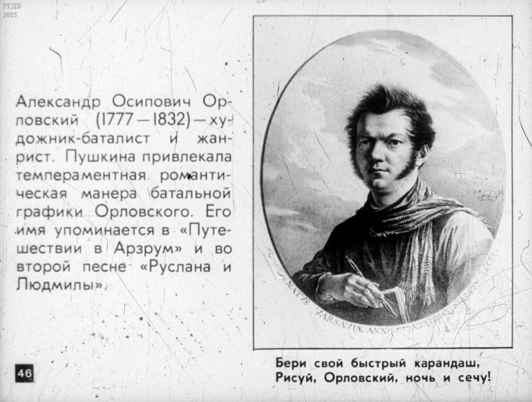 Александр Осипович Орловский (1777 —1832) — художник-баталист и жанрист. Пушкина привлекала темпераментная романтическая манера батальной графики Орловского. Его имя упоминается в «Путешествии в Арзрум» и во второй песне «Руслана и