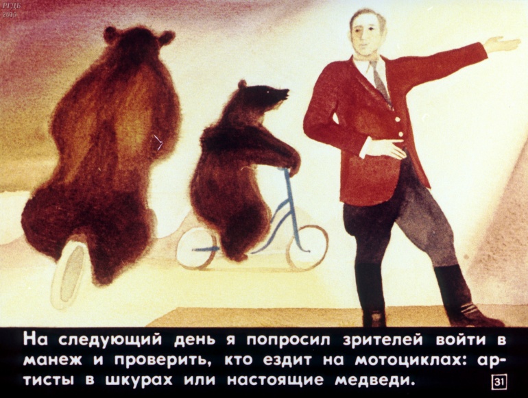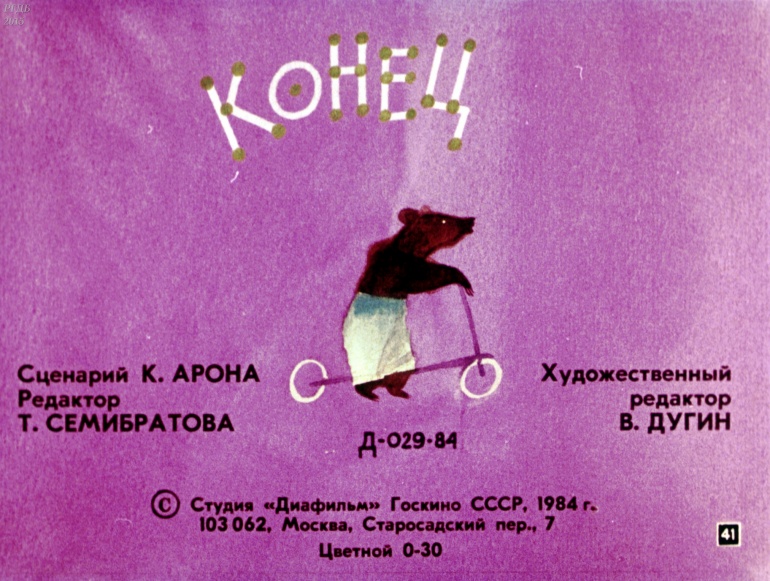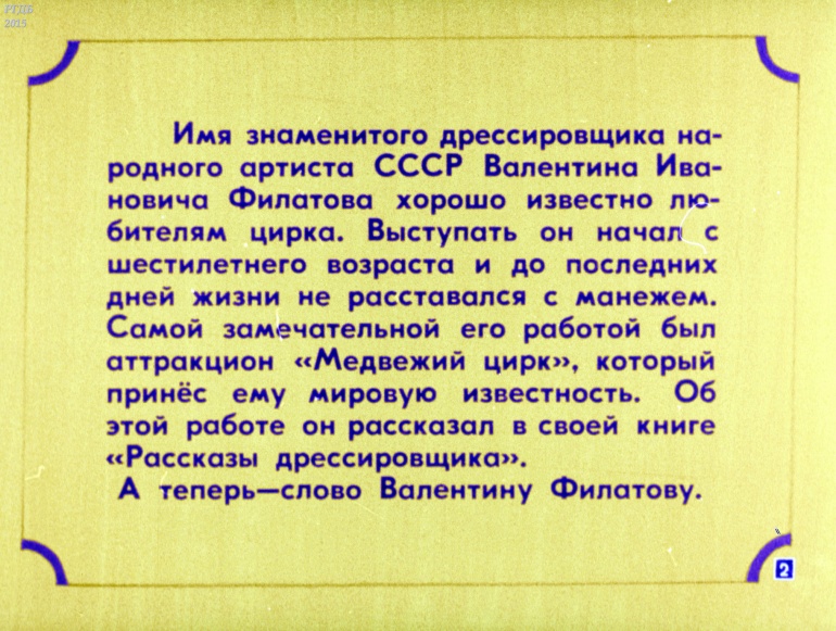 Медвежий цирк 0 Категория: ДиафильмыПросмотры: 778 В. Филатов. Диафильм "Медвежий цирк".Студия "Диафильм" Госкино СССР, 1984 год. Д-029-84, цветной 0-30 копеек