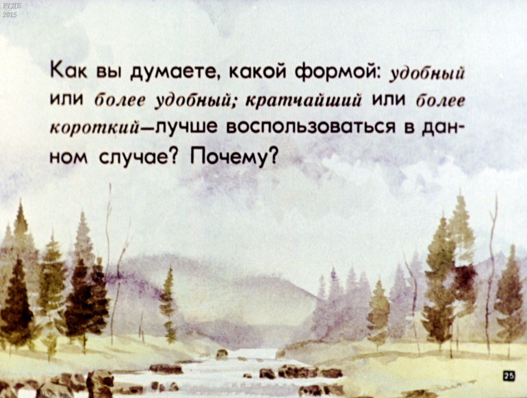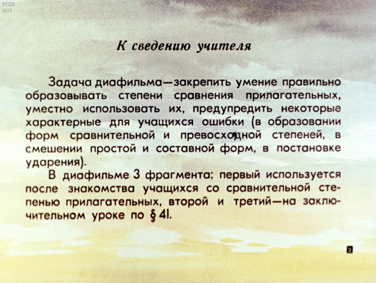 Прилагательные. Степени сравнения 1 Категория: ДиафильмыПросмотры: 641 Диафильм "Прилагательные. Степени сравнения". Для уроков русского языка в 5-м классеСтудия "Диафильм" Госкино СССР, 1983 год. Д-190-83, цветной 0-30 копеек