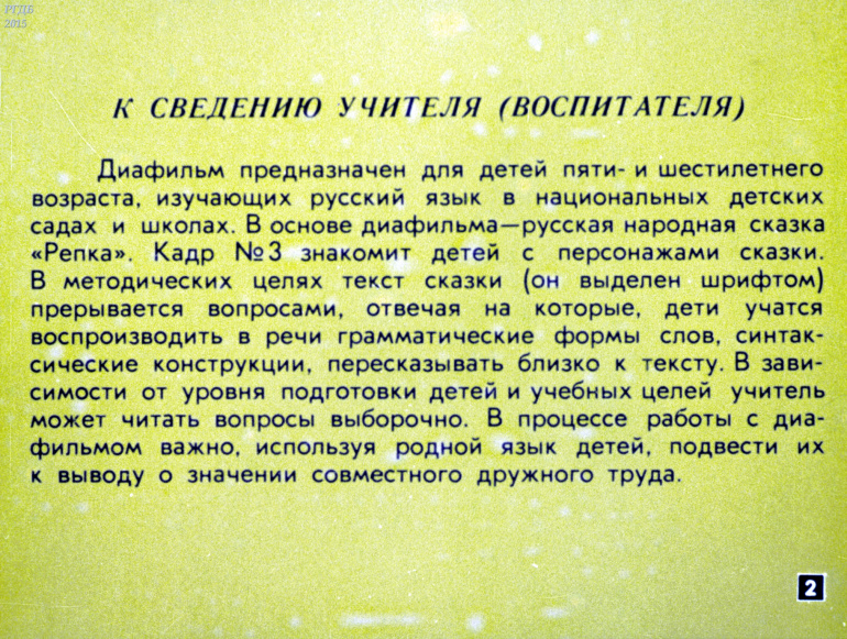 Сказка про репку 3 Категория: ДиафильмыПросмотры: 886 Диафильм "Сказка про репку". Русская народная сказкаСтудия "Диафильм" Госкино СССР, 1986 год. Д-91-86, цветной 0-30 копеек