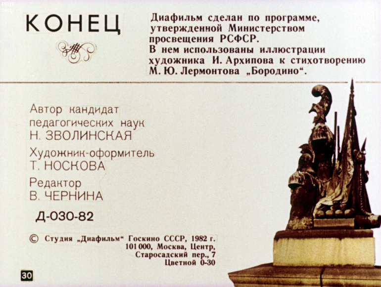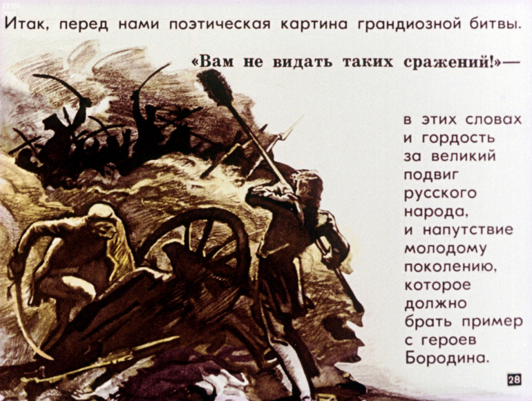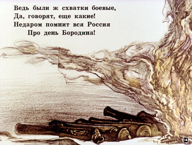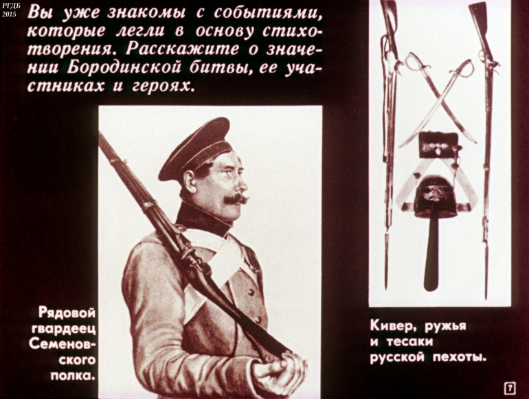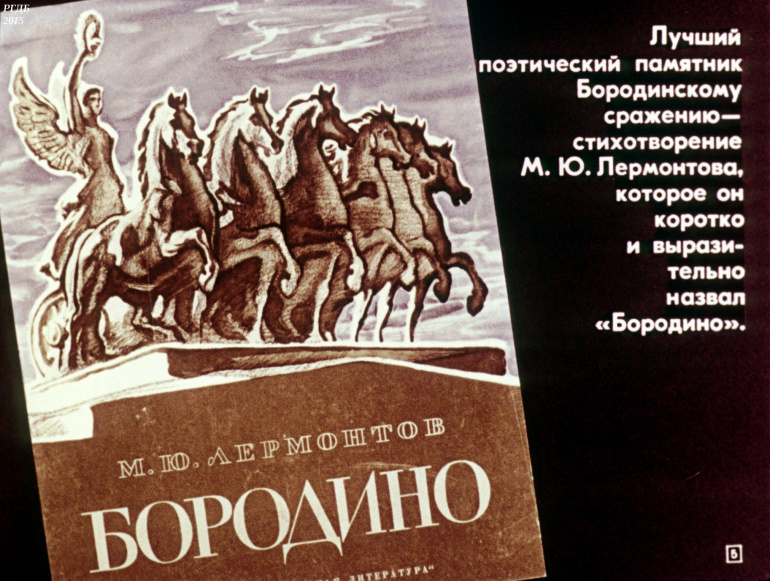 'Бородино' Стихотворение М.Ю. Лермонтова 15 Категория: ДиафильмыПросмотры: 1 919 Диафильм "Стихотворение М.Ю. Лермонтова "Бородино". Литература для 4 класса.Студия "Диафильм" Госкино СССР, 1982 год. Д-030-82, цветной 0-30 копеек