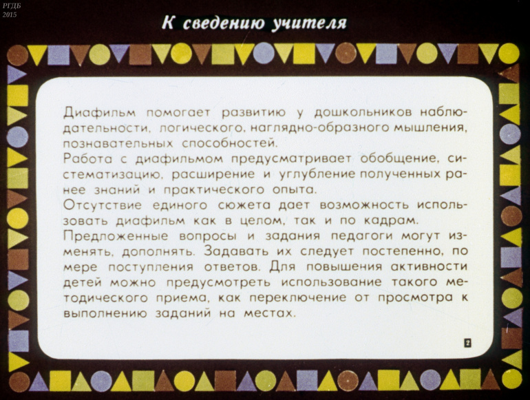 Цвет, размер и форма предмета 0 Категория: ДиафильмыПросмотры: 606 Диафильм "Цвет, размер и форма предмета". Для младшего школьного возраста и групп детских садовСтудия "Диафильм" Госкино СССР, 1984 год. Д-109-84, цветной 0-30 копеек