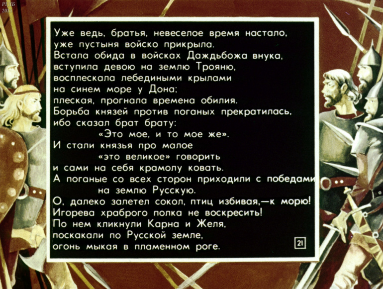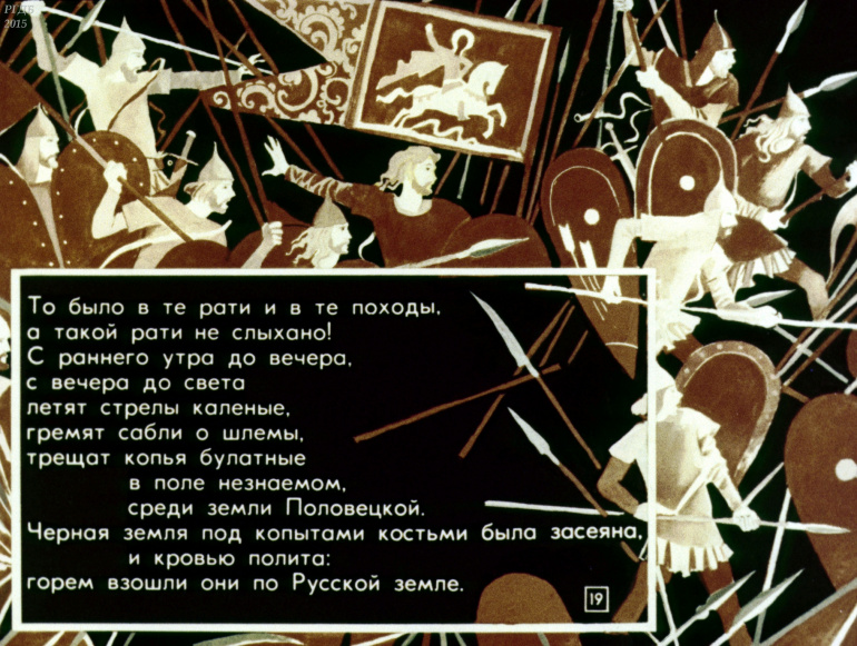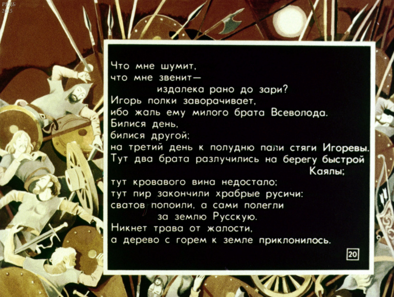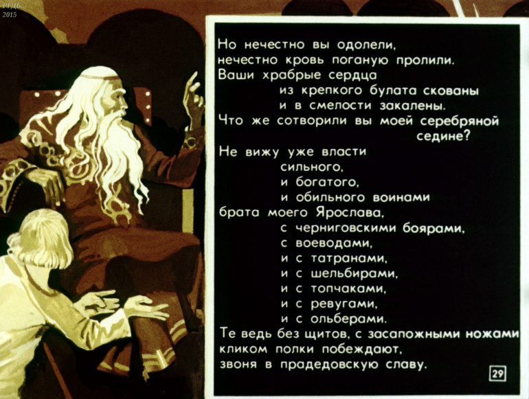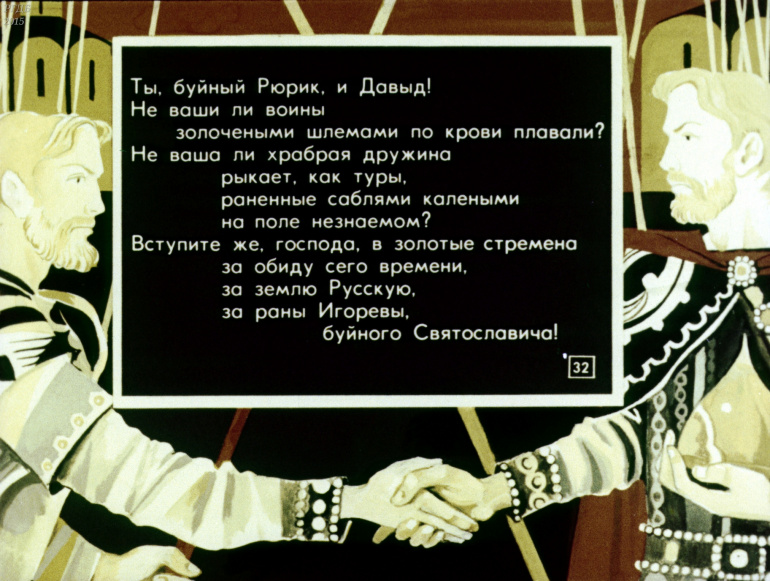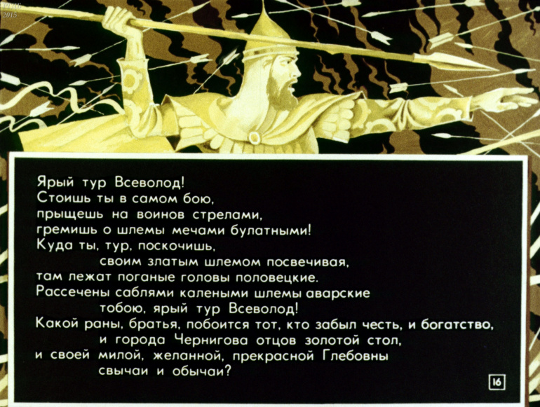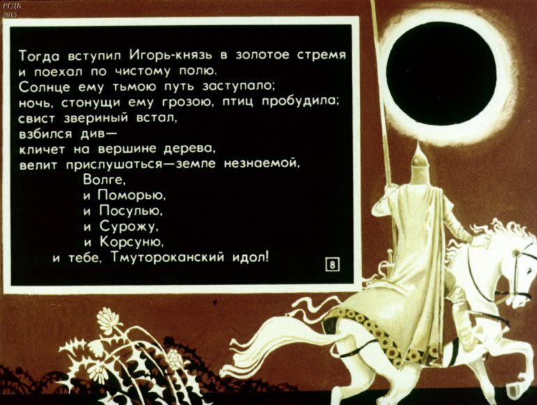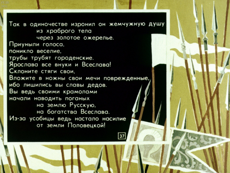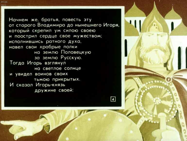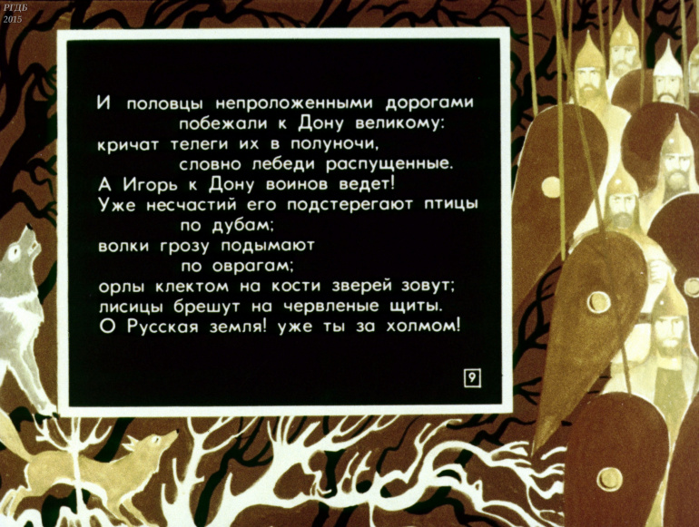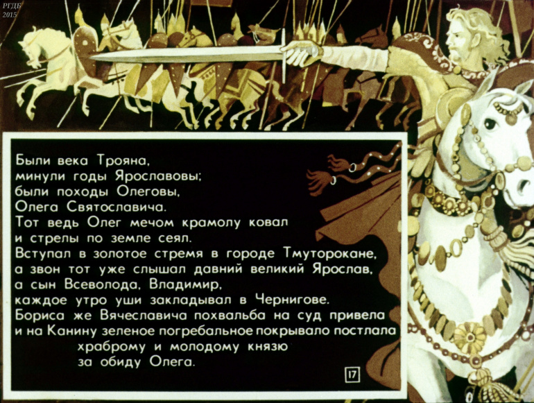 Слову о полку Игореве 0 Категория: ДиафильмыПросмотры: 732 Диафильм "Слову о полку Игореве". Перевод с древнерусскогоСтудия "Диафильм" Госкино СССР, 1986 год. Д-172-86, цветной 0-30 копеек