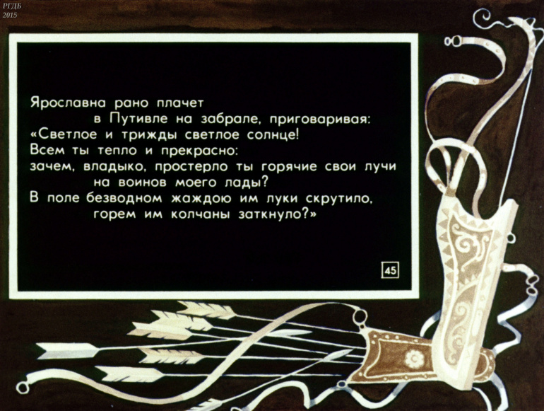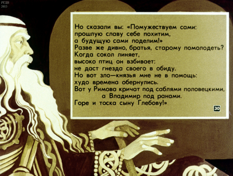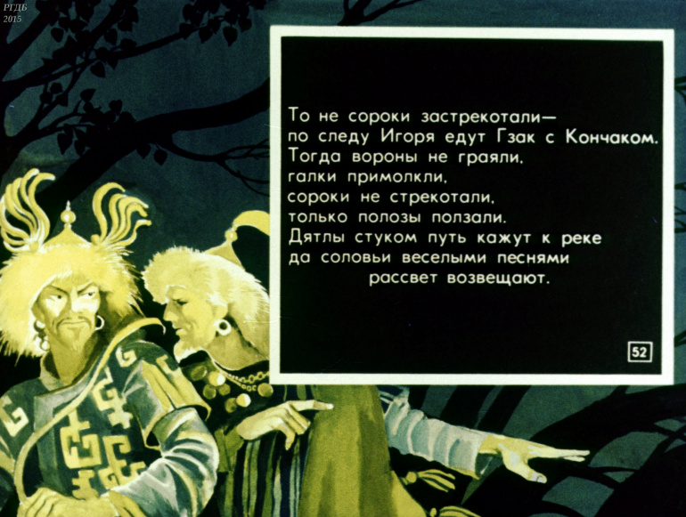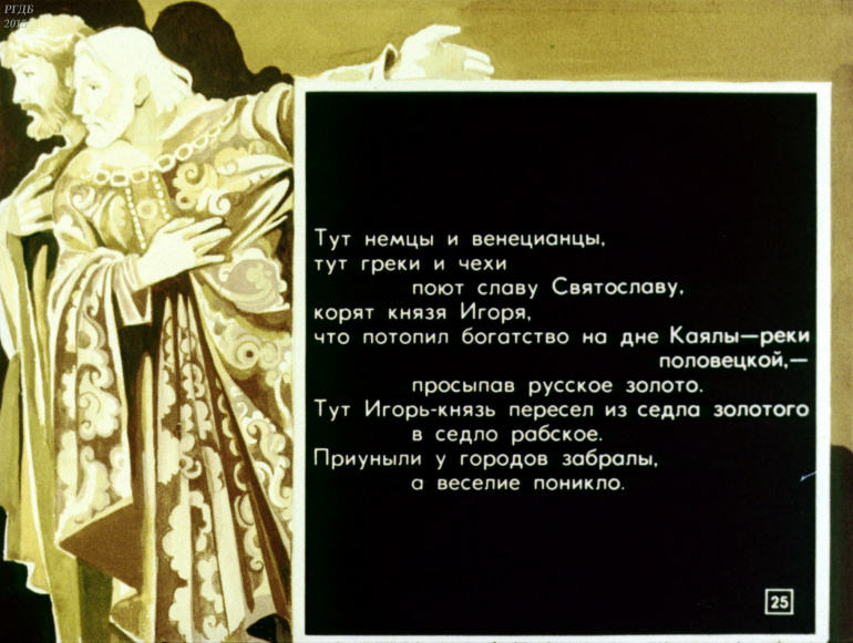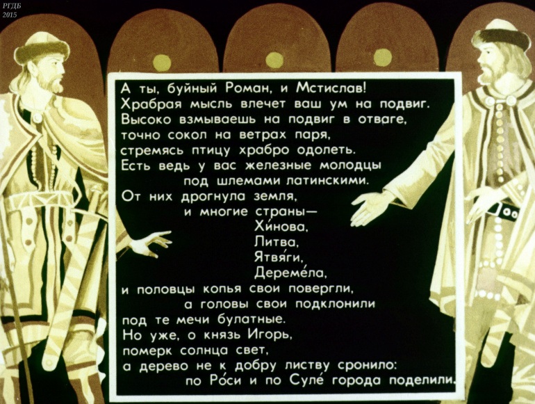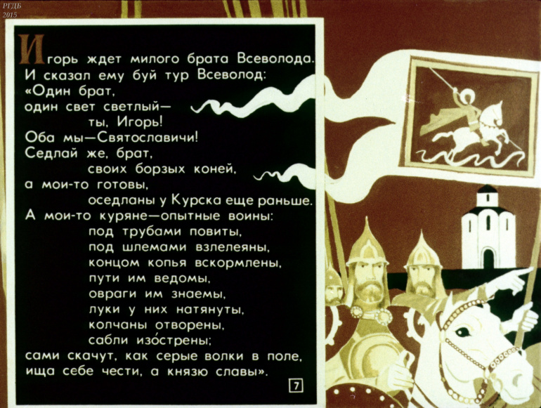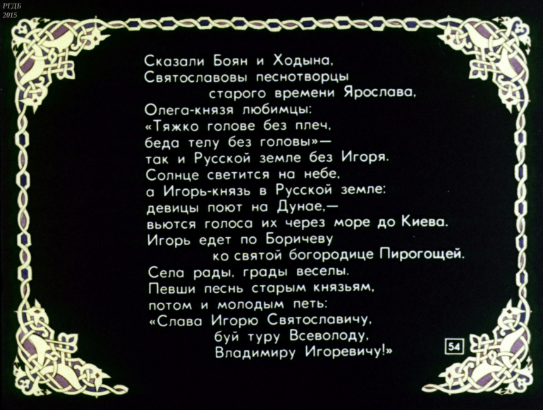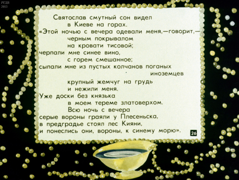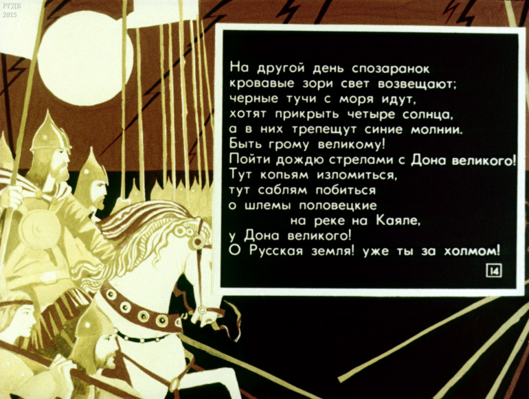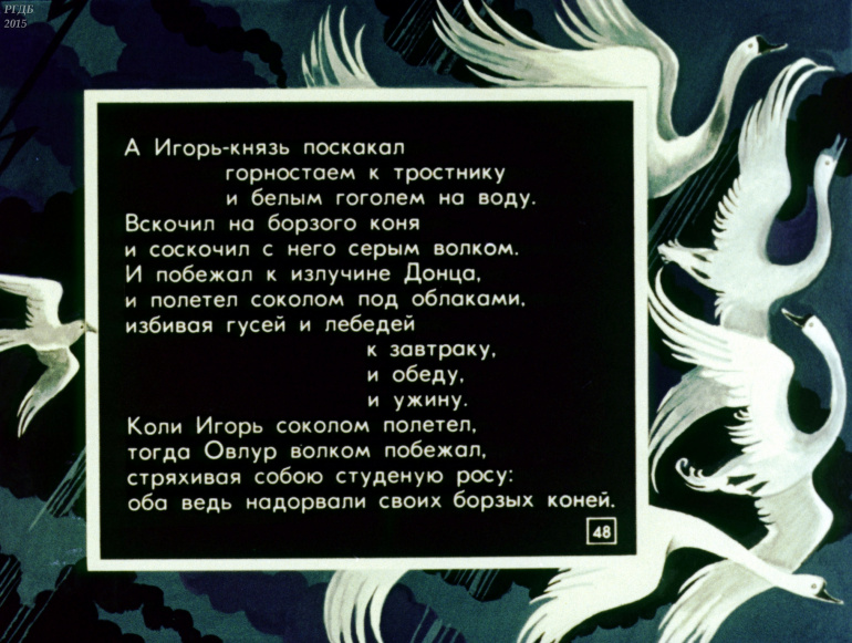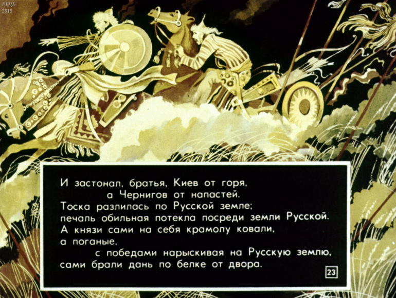 Слову о полку Игореве 0 Категория: ДиафильмыПросмотры: 732 Диафильм "Слову о полку Игореве". Перевод с древнерусскогоСтудия "Диафильм" Госкино СССР, 1986 год. Д-172-86, цветной 0-30 копеек