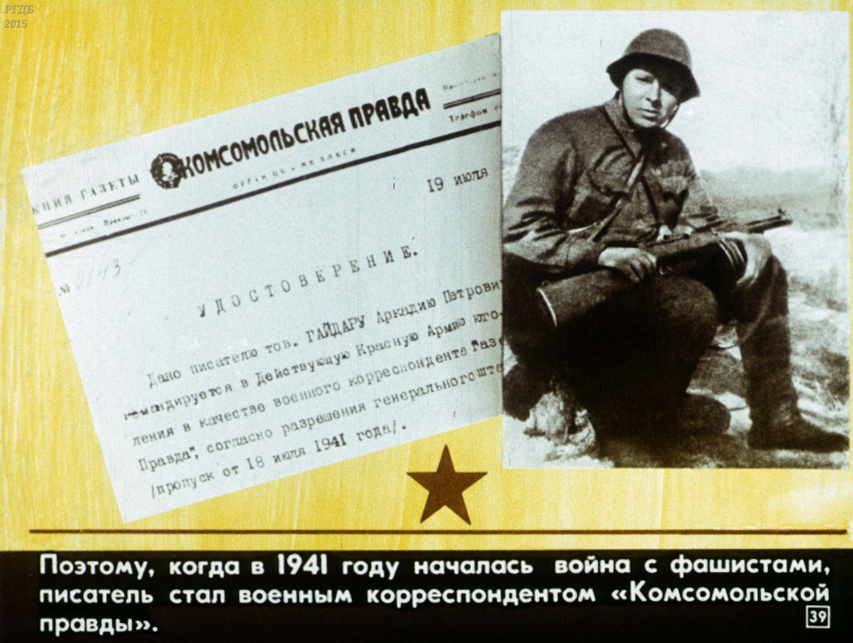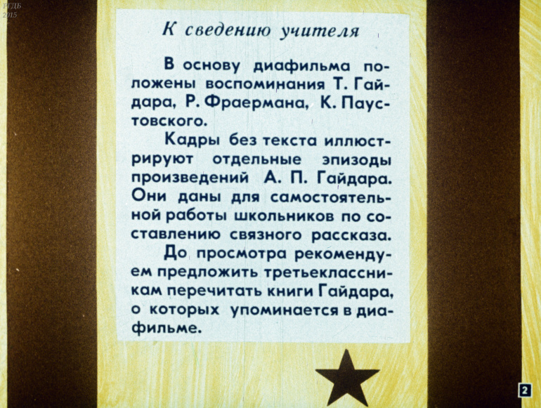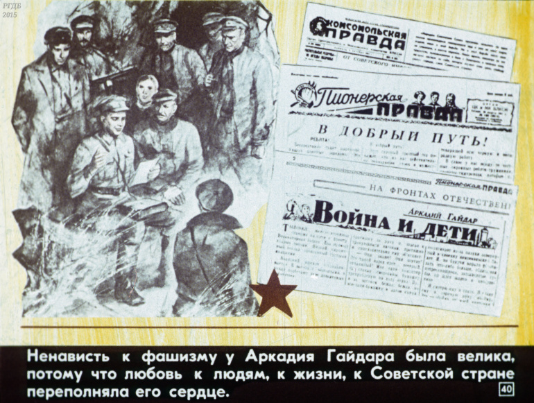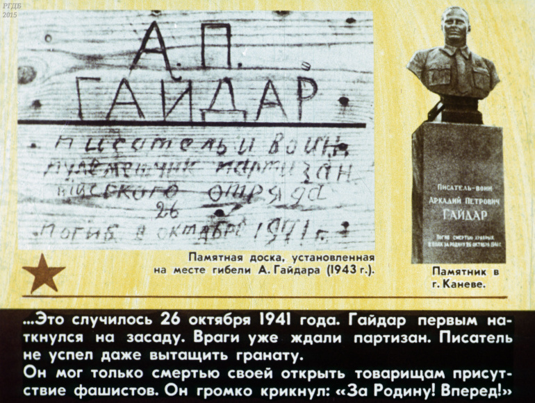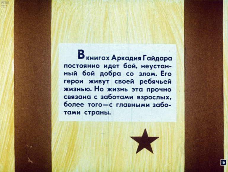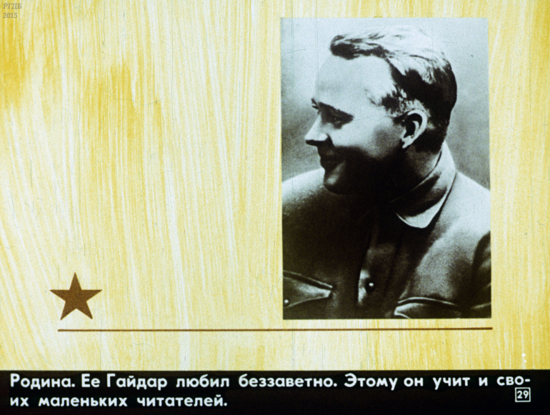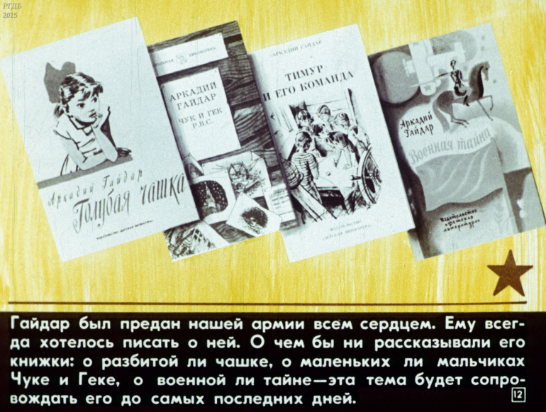 Аркадий Петрович Гайдар и его книги 1 Категория: ДиафильмыПросмотры: 915 Диафильм "А.П. Гайдар и его книги".Студия "Диафильм" Госкино СССР, 1989 год. Д-221-89, цветной 0-30 копеек