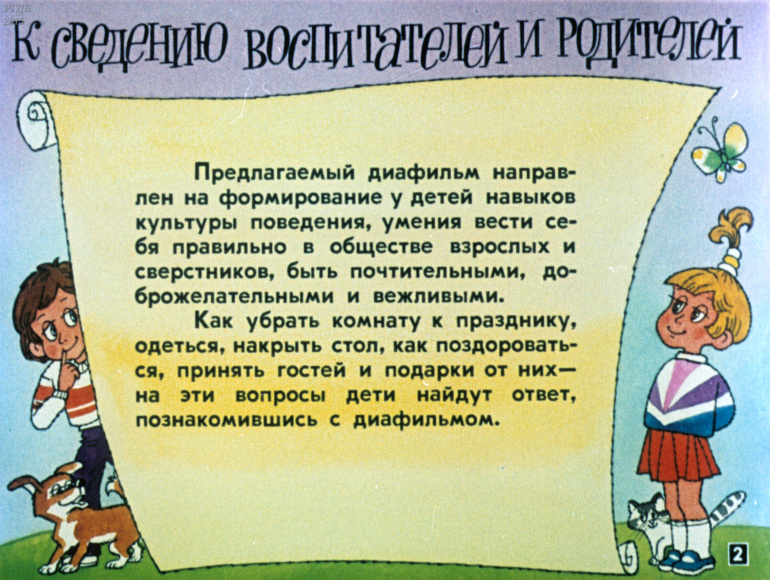 Если мы ждем гостей 2 Категория: ДиафильмыПросмотры: 729 Диафильм для детских садов и начальной школы "Если мы ждем гостей".Студия "Диафильм" Госкино СССР, 1990 год. Д-064-90, цветной