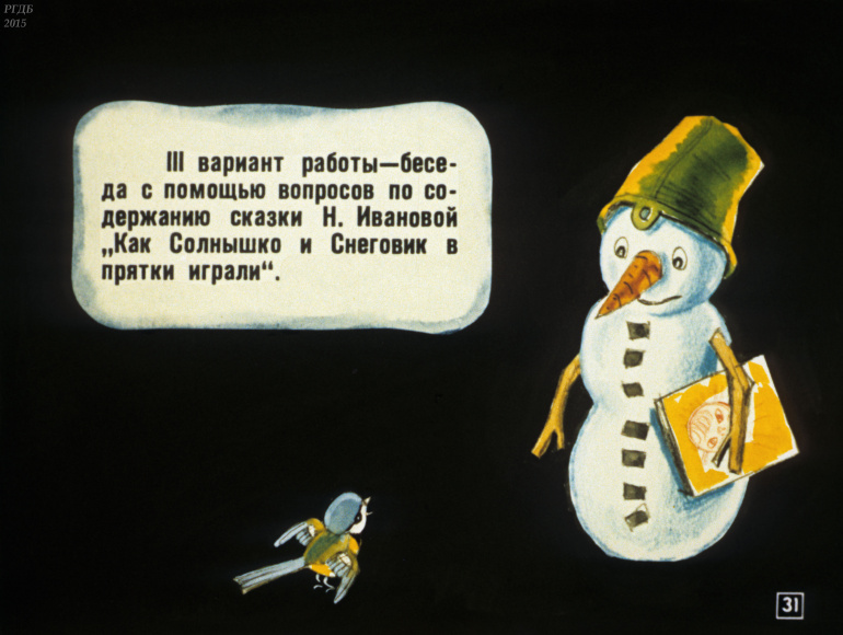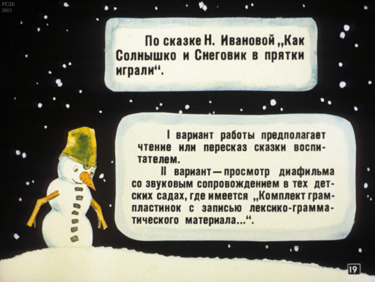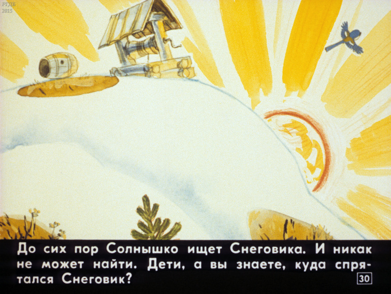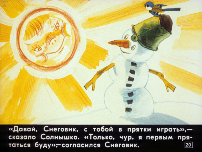 Как Солнышко и Снеговик в прятки играли 1 Категория: ДиафильмыПросмотры: 700 Диафильм "Как Солнышко и Снеговик в прятки играли".Студия "Диафильм" Госкино СССР, 1991 год. Д-091-91, цветной