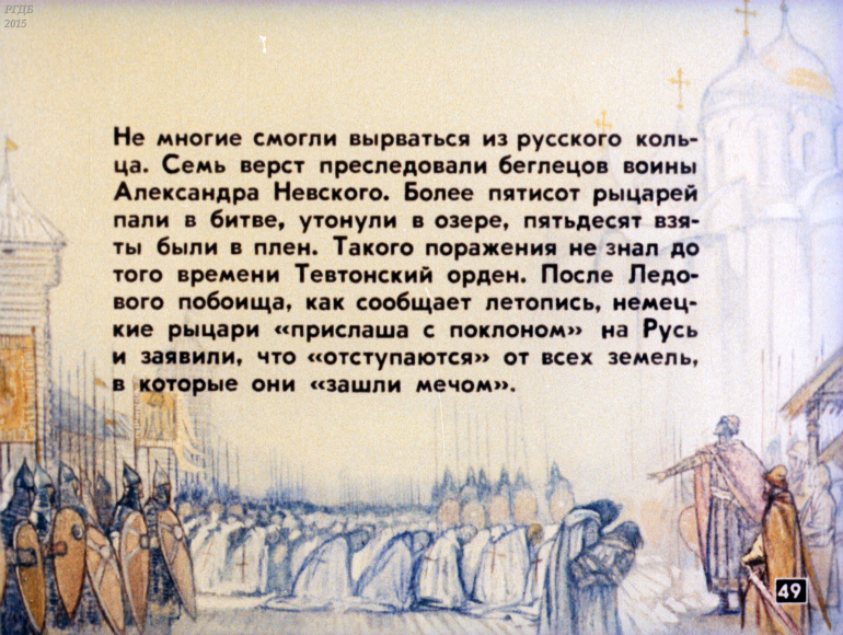 Ожившие страницы прошлого. Александр Невский 2 Категория: ДиафильмыПросмотры: 684 Диафильм "Ожившие страницы прошлого. Александр Невский". По мотивам одноименной повести О. ТихомировСтудия "Диафильм" Госкино СССР, 1991 год. Д-071-91, цветной