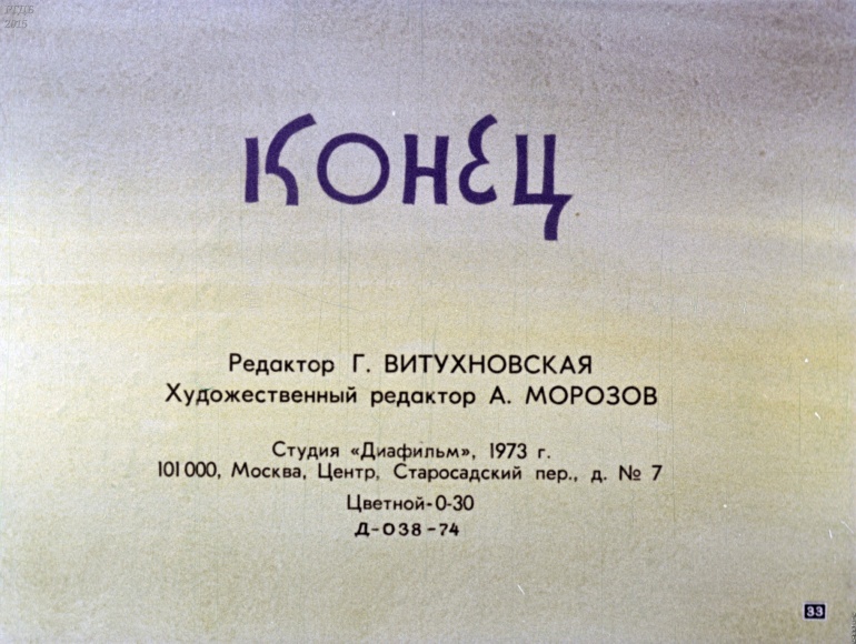 Вечерняя сказка 1 Категория: ДиафильмыПросмотры: 1 956 И. Токмакова. Диафильм "Вечерняя сказка".Студия "Диафильм", 1973 год. Д-038-74, цветной 0-30 копеек