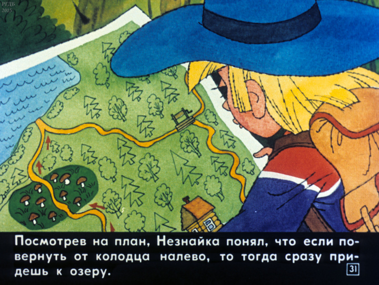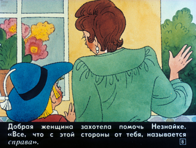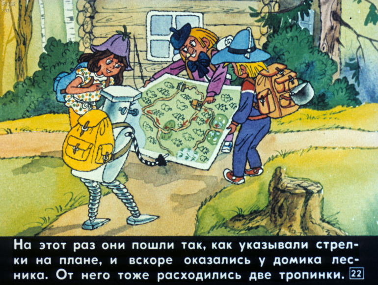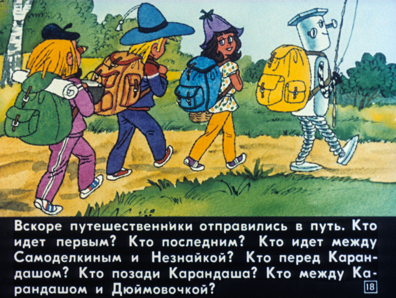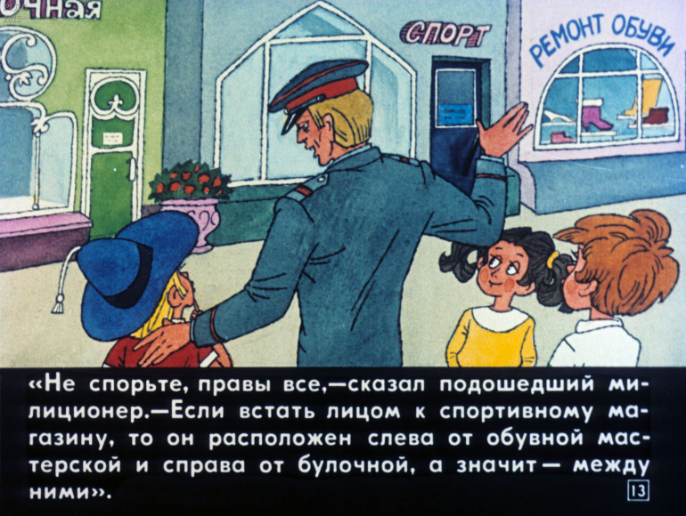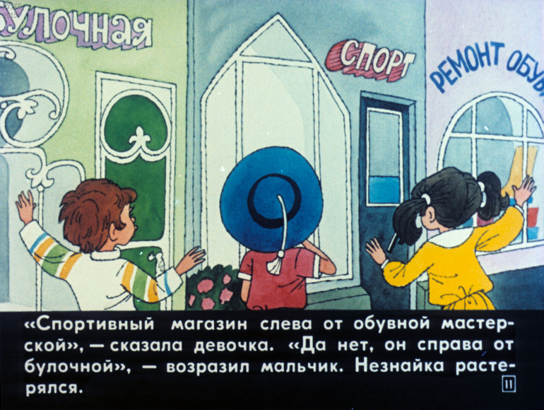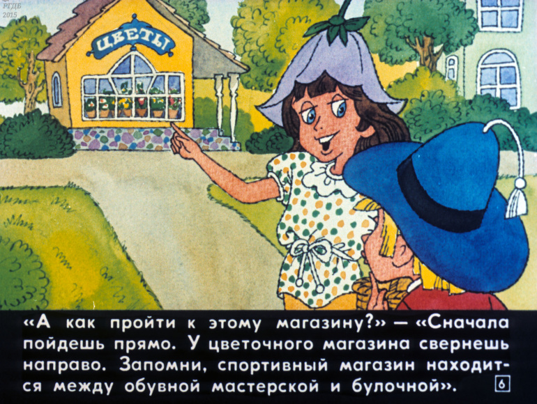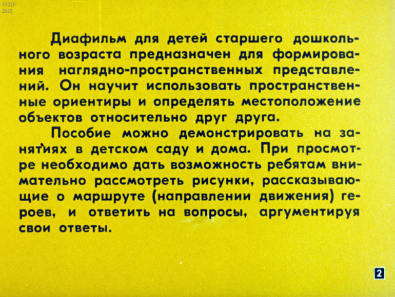 Диафильм для детей старшего дошкольного возраста предназначен для формирования наглядно-пространственных представлений. Он научит использовать пространственные ориентиры и определять местоположение объектов относительно друг друга.