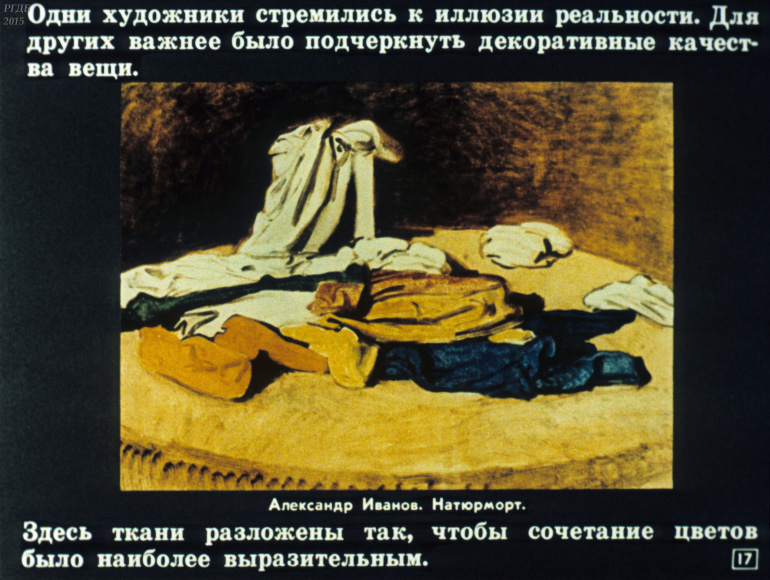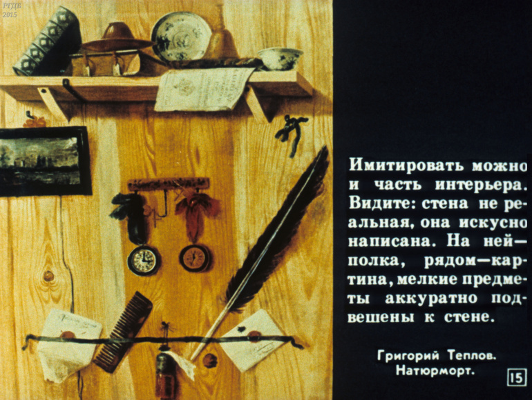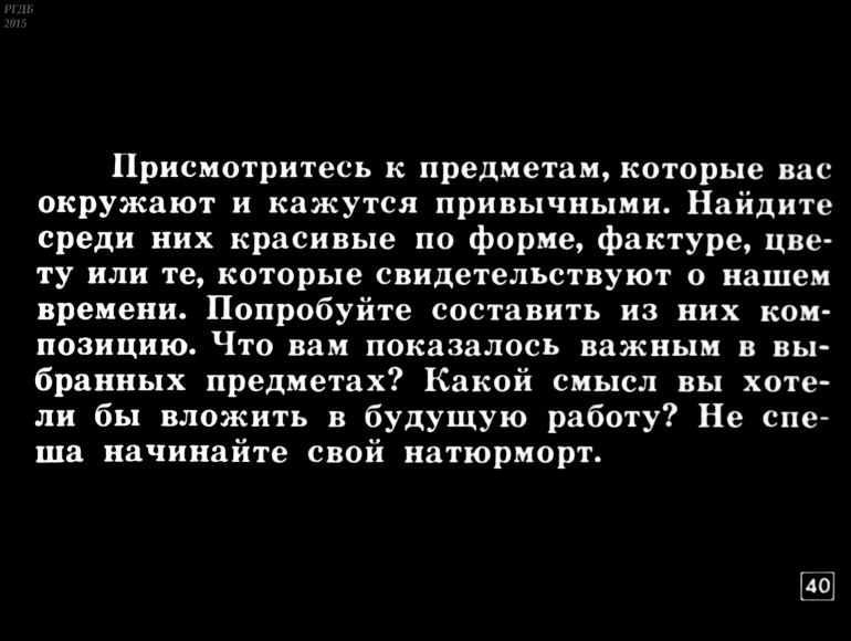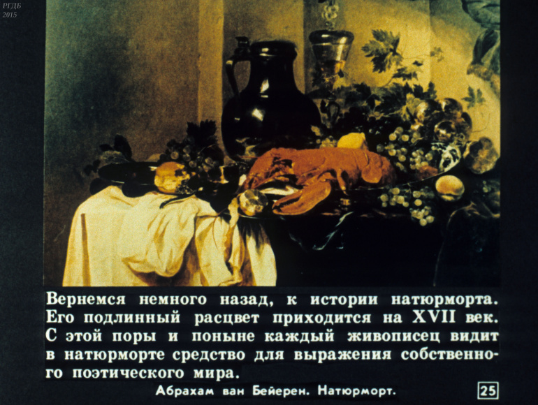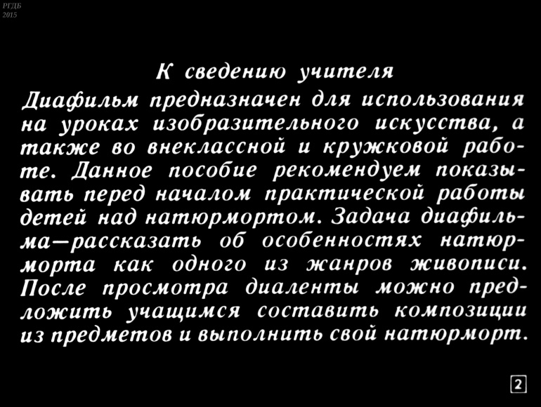 Работаем над натюрмортом 0 Категория: ДиафильмыПросмотры: 477 Диафильм "Работаем над натюрмортом". К урокам изобразительного искусства Студия "Диафильм" Госкино СССР, 1990 год. Д-102-90, цветной