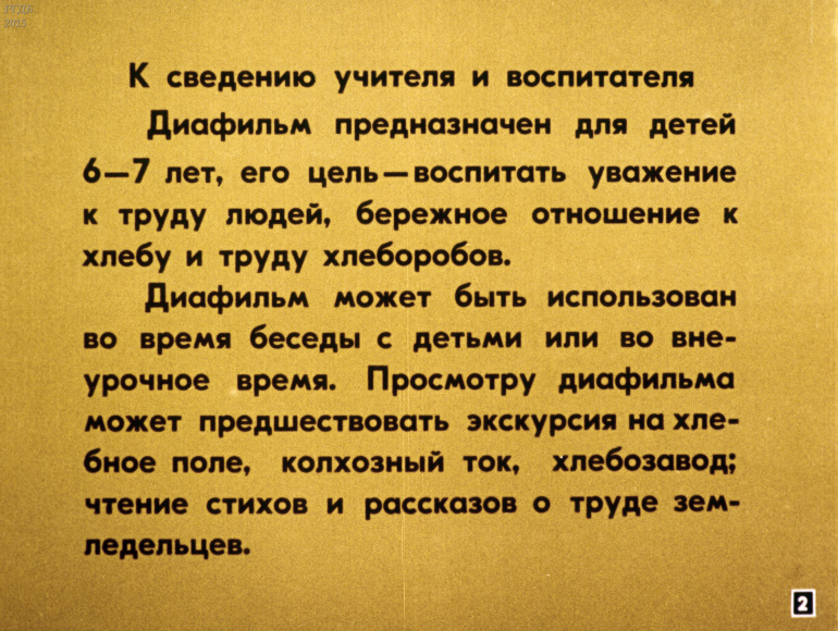 Хлеб - всему голова 2 Категория: ДиафильмыПросмотры: 507 Диафильм "Хлеб - всему голова".Студия "Диафильм" Госкино СССР, 1988 год. Д-081-88, цветной 0-80 копеек