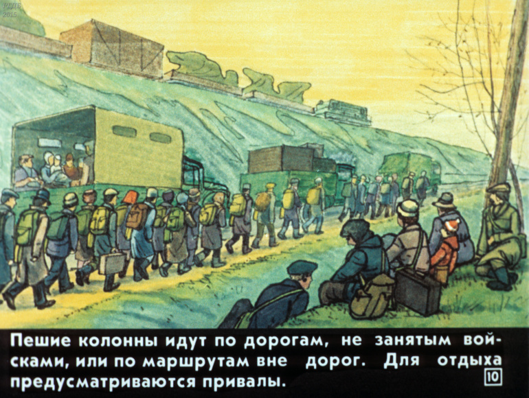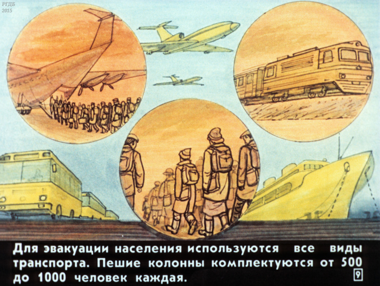 Для эвакуации населения используются все виды транспорта. Пешие колонны комплектуются от 500 до 1000 человек каждая.