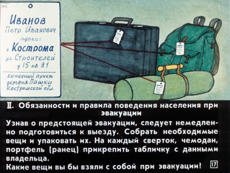 Узнав о предстоящей эвакуации, следует немедленно подготовиться к выезду. Собрать необходимые вещи и упаковать их. На каждый сверток, чемодан, портфель (ранец) прикрепить табличку с данными владельца.