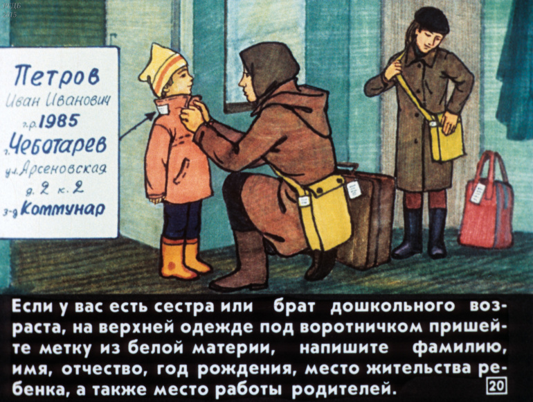 Если у вас есть сестра или брат дошкольного возраста, на верхней одежде под воротником пришейте метку из белой материи, напишите фамилию, имя, отчество, год рождения, место жительства ребёнка, а также место работы родителей.