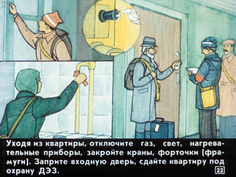 Уходя из квартиры, отключите газ, свет, нагревательные приборы, закройте краны, форточки (фрамуги). Заприте входную дверь, сдайте квартиру под охрану ДЭЗ